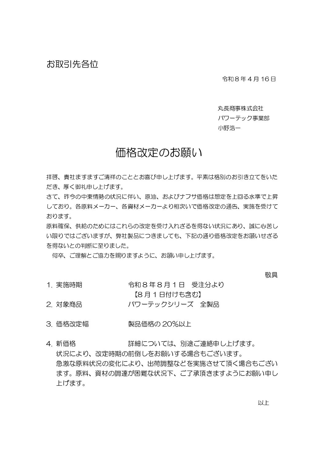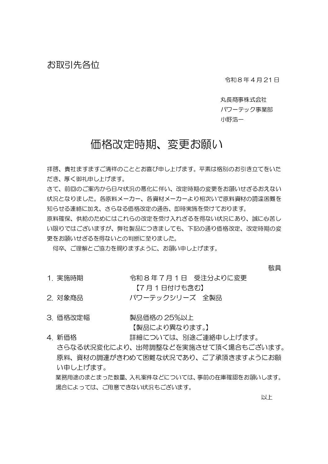 2026.4.16 中東情勢を背景とした価格改定のご案内【パワーテック事業部】